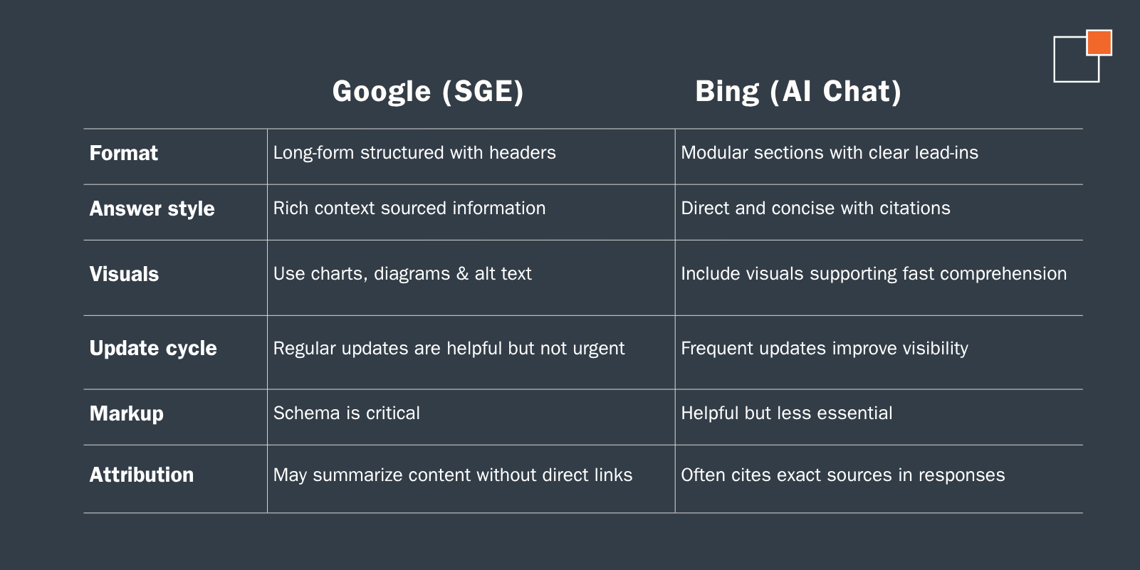 Formatting needs: Google looks for structured content that fits into its knowledge graph; Bing favors content broken into scannable, modular sections