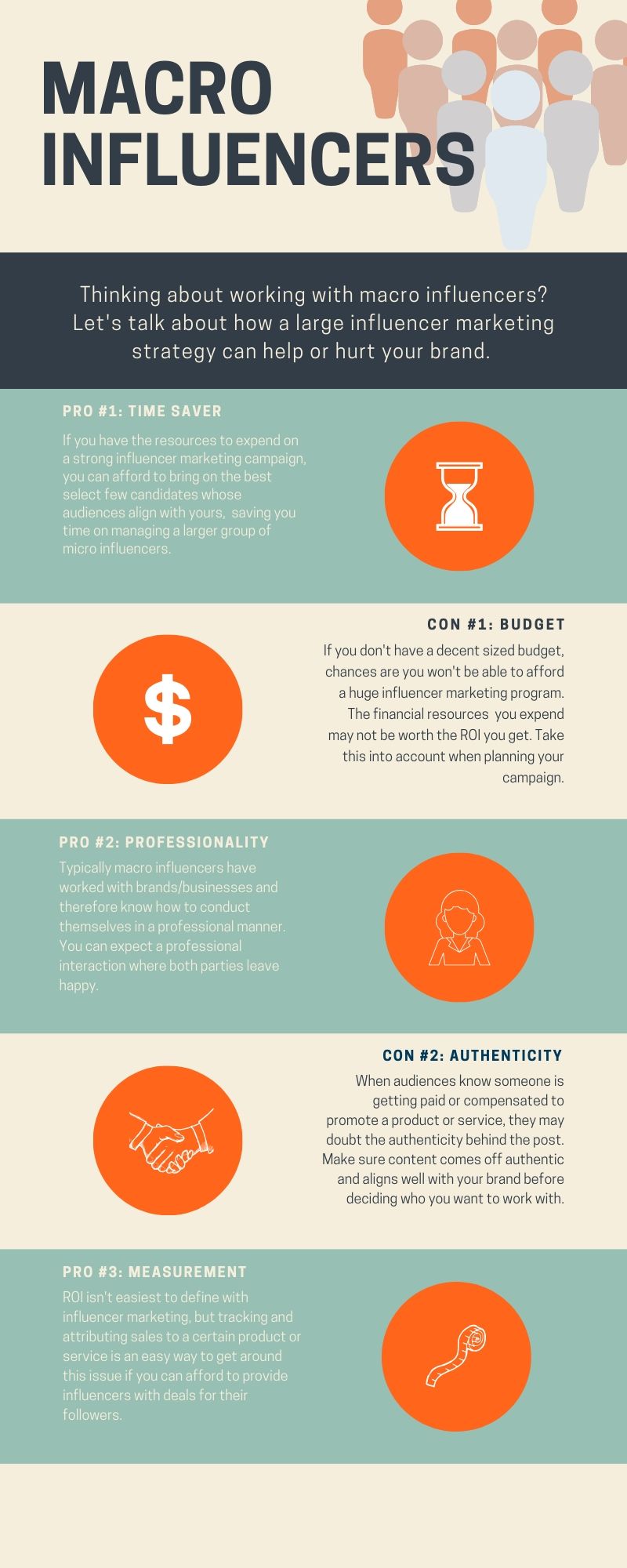 - Measurement. ROI isn’t always the easiest to define in an influencer marketing campaign, but with macro influencers, it can be easier. For example, Social Media Today reminds us that brands often provide larger influencers with deals to give their followers, making it easier to track and attribute sales to a certain product or service.