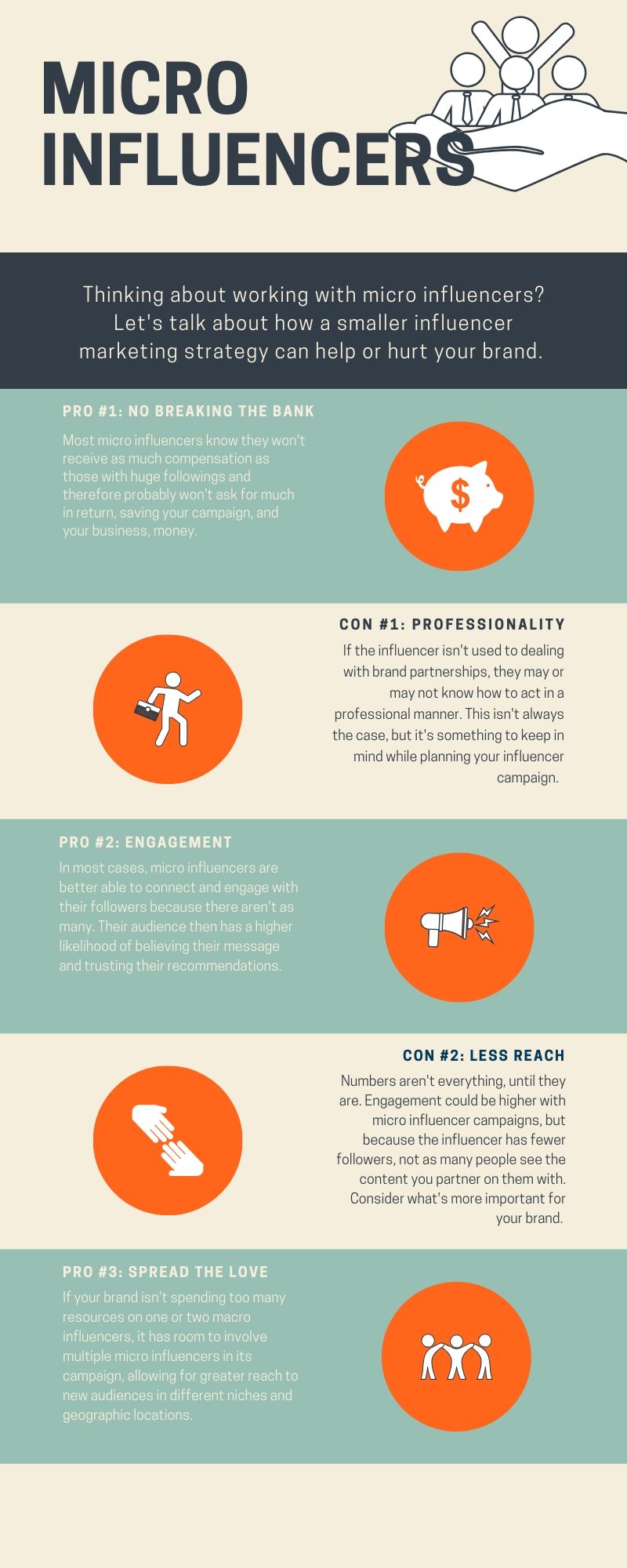 - Spread the love. If your brand isn’t spending too many resources on one micro influencer, it has room to involve multiple micro influencers in its campaign. This allows for greater reach to new audiences separated by niche and geographic location, among others.