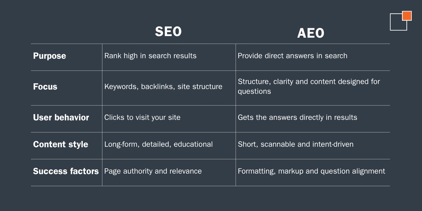 Before we get into strategy, let’s get the basics straight. SEO and AEO support the same goal—helping people find your content—but they do it in different ways.